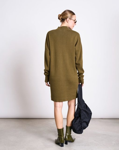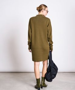 Chic, cozy and warm! Sounds perfect? Meet our knit dress NUNA! NUNA is a short-length dress which comes with a high collar and slight bat sleeves. The dress is oversized on the upper body and tighter at the bottom. The fabric is a 100% heavy organic cotton knit and it’s GOTS certified. Please note:This garment is made of 100% cotton. We try to avoid unnecessary synthetic fibers, such as elastane, wherever possible. That is why this garment might stretch out and change the shape while wearing it. The good news: the style will be back in shape after washing. So, no panic – it’s just organic. Thanks for your understanding, dear!