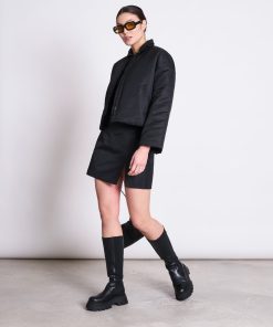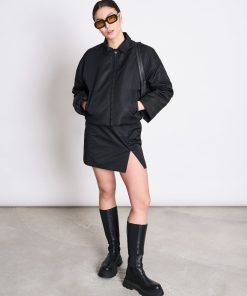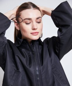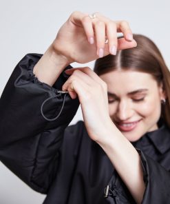 You are looking for a perfect and sustainble blouson? Here you go. This is our new blouson DUSK, made from recycled material. The fit is cropped, but oversized, which brings the blouson the effortles and cool look. It features a classic collar, two pockets in the front and a zipper for closure.Made from SEAQUAL® YARN, a material we‘ve discovered that aligns with our com- mitment to environmental responsibility. The Seaqual Initiative, a non-profit organization dedicated to addres- sing marine pollution and promoting sustainability, is at the forefront of this effort. Specializing in the collection and recycling of marine plastic waste, particularly from oceans and coastal areas, the initiative produces SEA- QUAL® YARN, a polyester derived in part from marine waste and post-consumer PET from land sources. Also, the fabric features water-repellent properties.