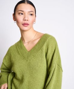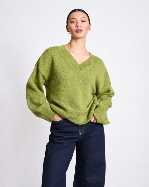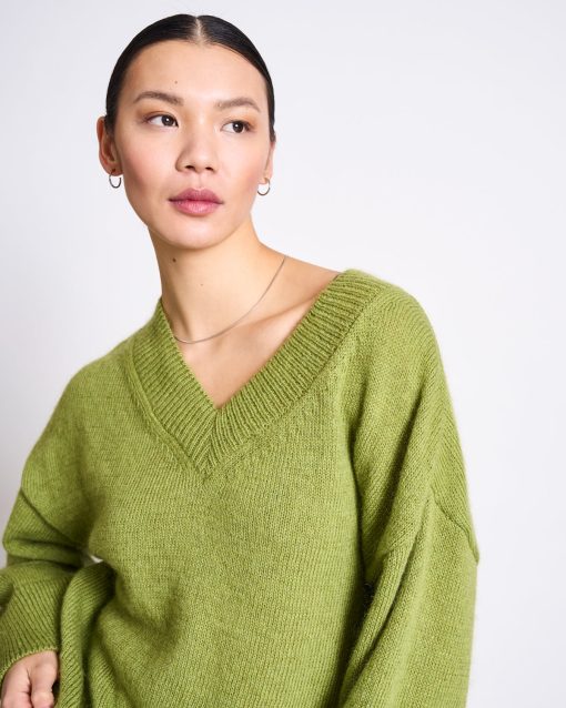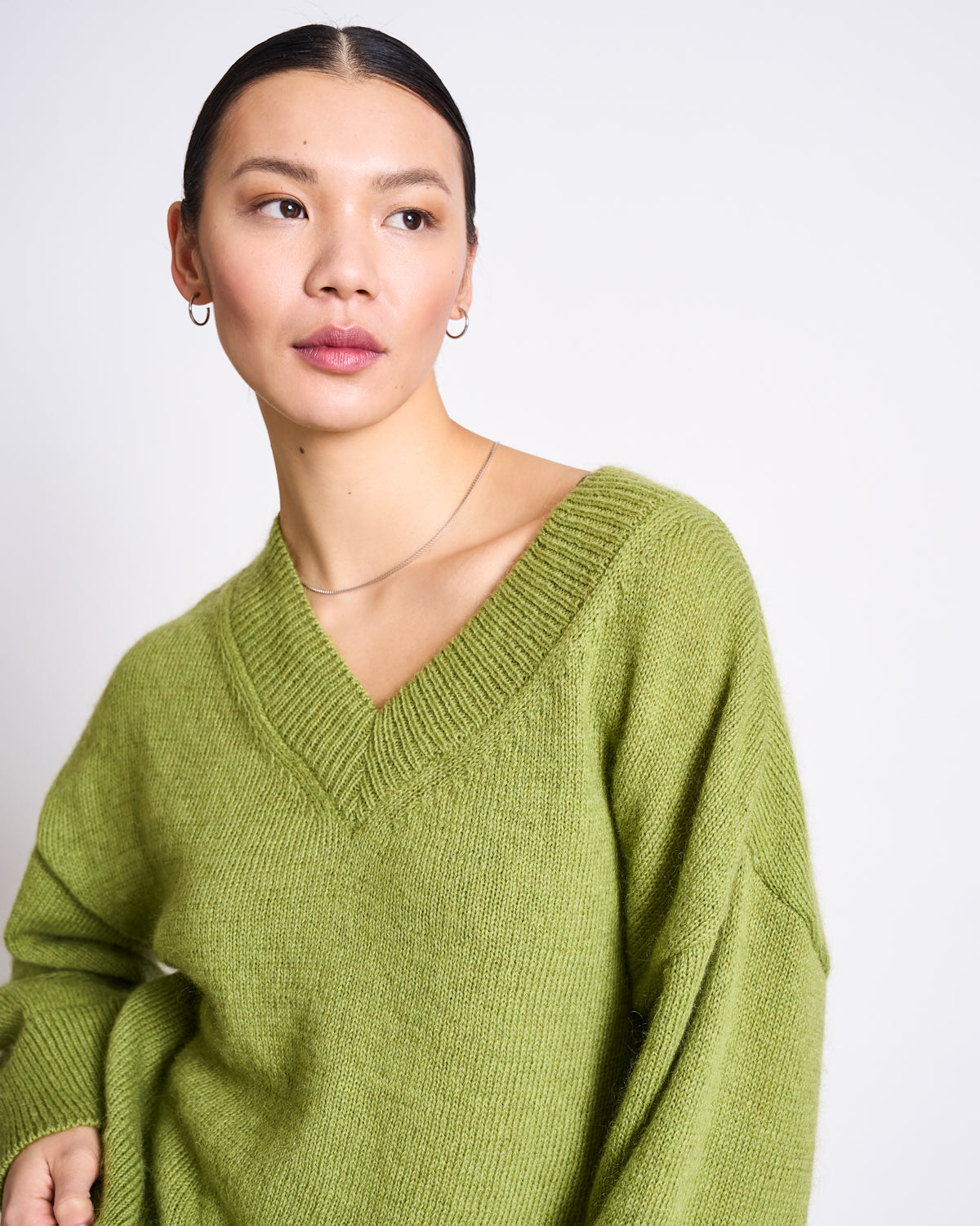 Stay warm and stylish with our OVERSIZED REC. MOHAIR V-NECK JUMPER YICA.This sweater features a trendy v-neck, has a regular length, overlapping shoulders, slightly longer sleeves and will keep you cozy all winter long. Upgrade your wardrobe with this must-have piece! Because of the recycled Mohair it is extra fluffy and light. The knit yarn is made out of a mix of 50% Mohair and 50% Wool. Super warm and cozy!