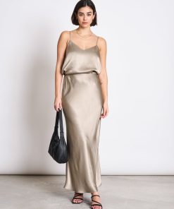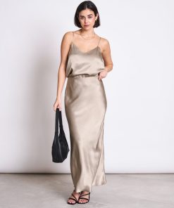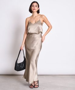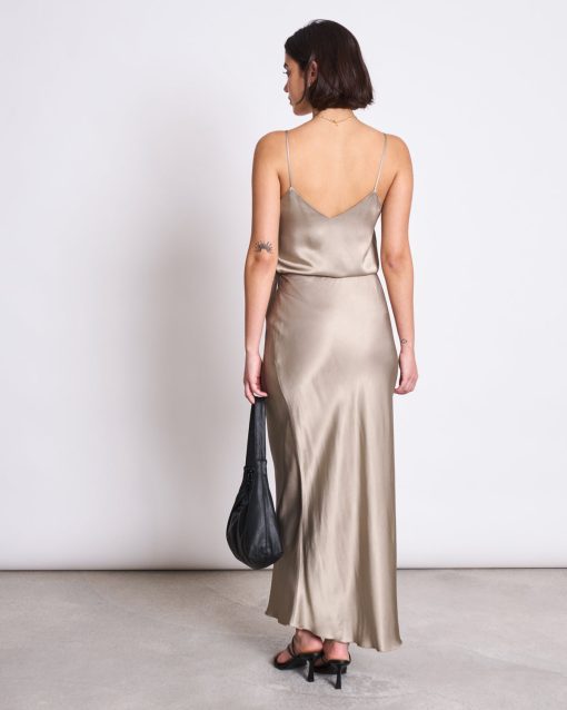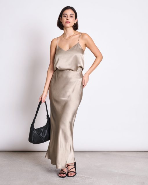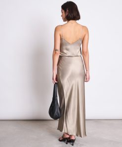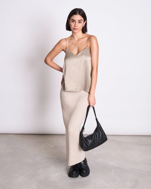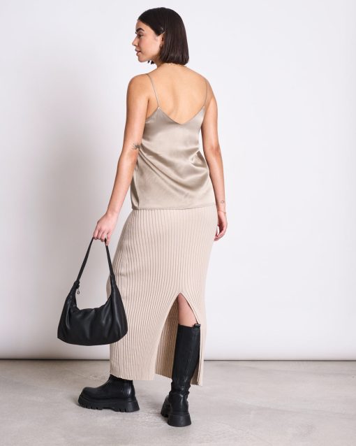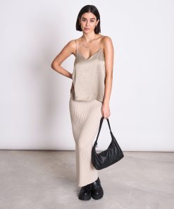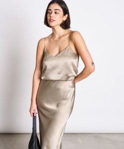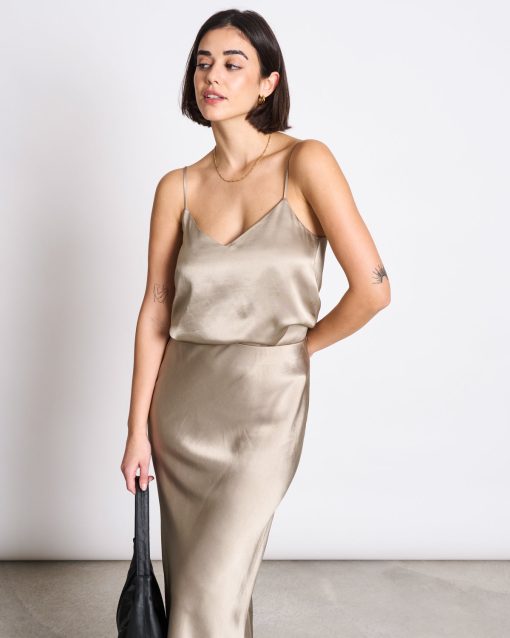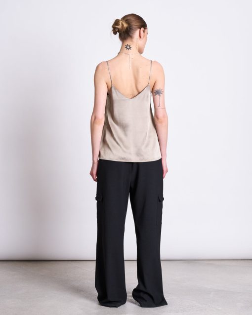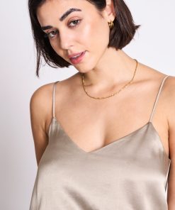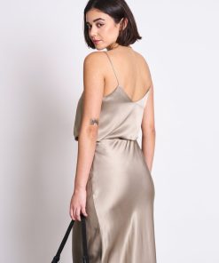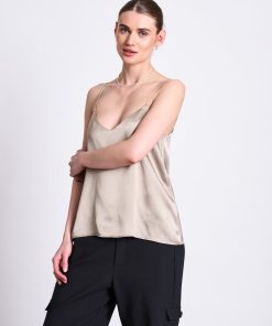 Fancy, fancier, MAUD!This beautiful slip top with a wide V-neckline and delicate spaghetti straps is a chic essential for your capsule wardrobe. The cut is straight and loose, without chest darts, offering a relaxed yet elegant silhouette.You can wear it to your next festive event, for a night out, or even layered over a turtleneck on colder days.The fabric is a blend of ENKA® Viscose and CIRCULOSE® – a new, innovative material made from recycled cotton sourced from worn-out garments and production waste. This combination results in a luxurious textile that looks and feels as lustrous as silk, while being completely vegan.