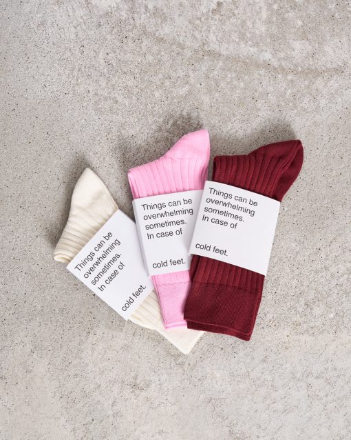 In case of cold feet These are our socks. They come in many different color ways for all the different moods and outfits.Made from 98% organic cotton and 2% elastane to make them comfy and soft.